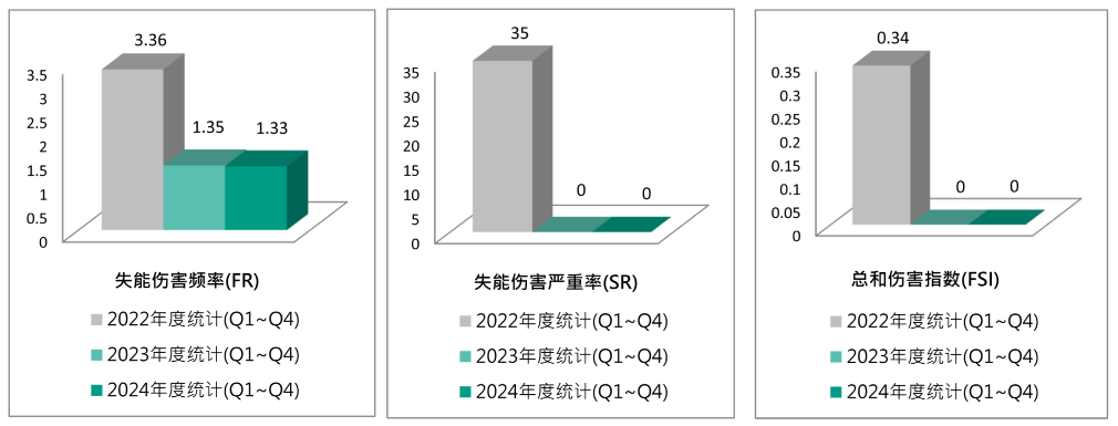 本公司为落实职场零灾害运动,年度订定绩效量测指标之总和伤害指数(FSI)较前一年(2023)总和伤害指数平均值下降20%【2024年度FSI≦0.22,年度职灾件数≦4件,且累积损失日数≦43日】,2024年度职灾件数总计2件,失能伤害频率、严重率及总和伤害指数分别为1.33、0和0,达年度设定之绩效量测指标,对于年度发生职灾事件将引以为戒,确保员工安全生产零职灾。