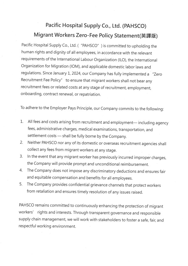 太医尊重并支持国际公约中之基本人权,包含「联合国世界人权宣言」、「联合国全球盟约」、「国际劳工组织工作基本原则和权利宣言」之原则与精神,不雇用童工、禁止强迫劳动、反对聘雇上的歧视或差别待遇、提供安全卫生之工作环境等,并遵守劳动相关法规,尊重员工组织、参与工会和集体谈判之权利,针对所有新进人员进行职场性别工作平等、禁止工作场所性骚扰及申诉制度说明,确实保障员工合法权益。本公司之员工任免、薪酬等作业均合乎法令规定,订定并公告各项工作规则与相关管理办法、程序,建立公平的绩效考核制度,提供多元的培训进修管道,善尽雇主之责任义务。