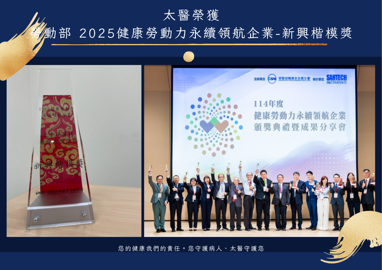 太医将劳工健康视为企业永续的核心竞争力,凭借卓越的职安卫绩效与人权典范,以「健康职场心守护、生产安全零职灾」为核心目标,并积极带领供应链共同提升健康劳动力,于 2025 年 10 月 28日荣获劳动部颁发「健康劳动力永续领航企业新兴楷模奖」,肯定了太医在 ESG 社会责任上的卓越实践。太医将持续导入 KPI 成效回馈与自主提案制度,扩大组织参与及外部合作,落实永续治理与产业影响力,迈向领航型健康职场典范。