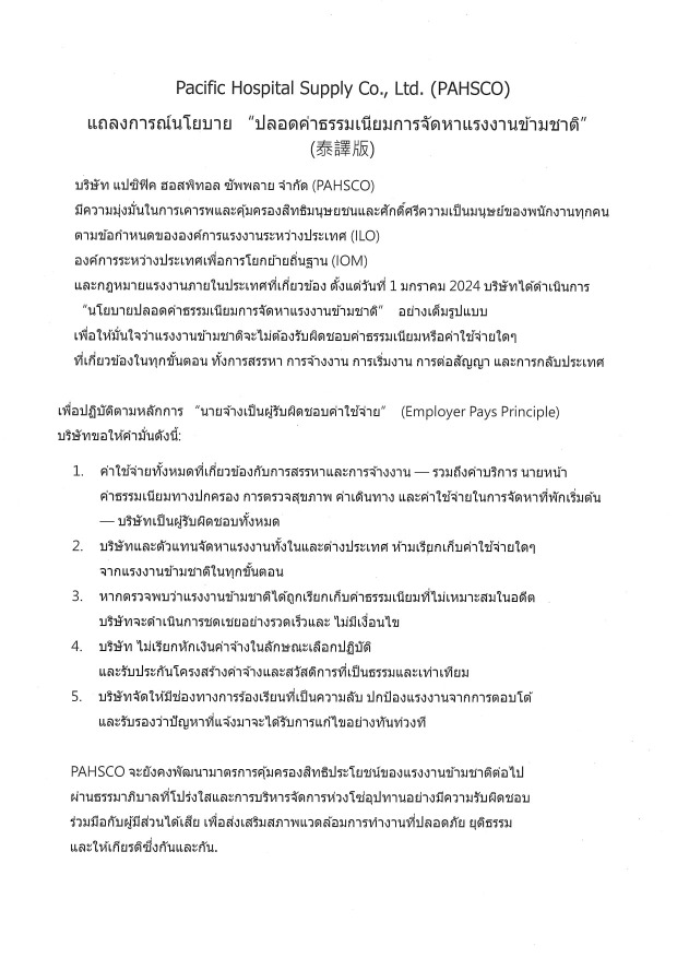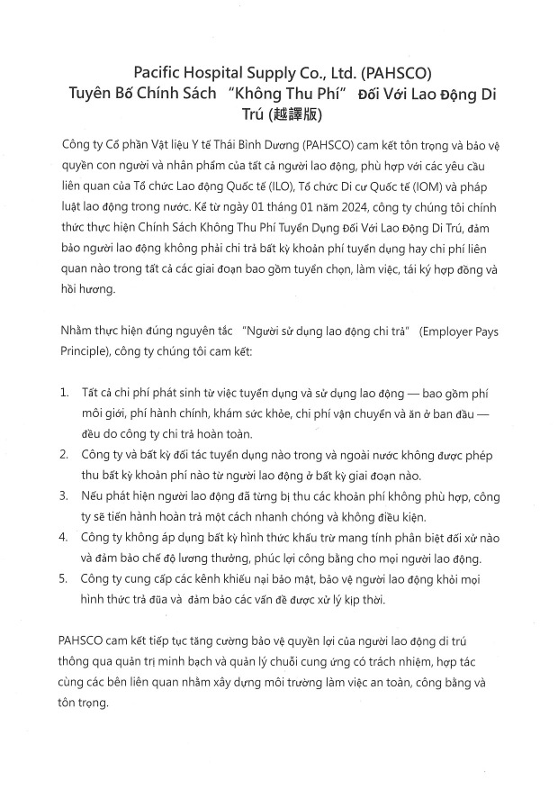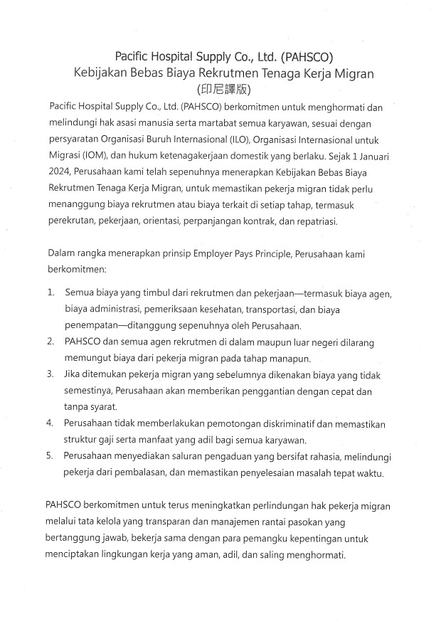 PAHSCO respects and supports the fundamental human rights of international conventions, including the principles and spirit of the United Nations Universal Declaration of Human Rights and the United Nations Global Compact, and implement: We do not employ child labor, prohibit forced labor, oppose discrimination or differential treatment in employment, provide a safe and sanitary working environment, etc.