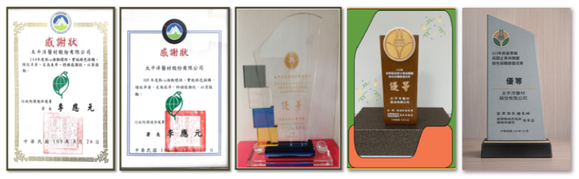 本公司著手推動綠色管理,持續研發製造具綠色競爭力的醫療器材產品,減少醫療廢棄物的處理,並供國內外客戶選擇使用,透過綠色策略及綠色商機的行銷,提升本公司的綠色形象。在綠色採購方面,公司內使用之資訊設備、電腦週邊設備、影印紙、衛生紙等紙類用品,皆選用具環保標章的材質,積極配合政府推動綠色採購政策,並展現優良成果;另外,努力將產品包裝材積最佳化,全面檢視產品之外部包裝設計,降低包裝材料的使用量,進而減少不必要的空間浪費,避免運輸上產生的額外成本。自106年起多次榮獲行政院環保署及苗栗縣政府環保局綠色採購績優單位表揚。